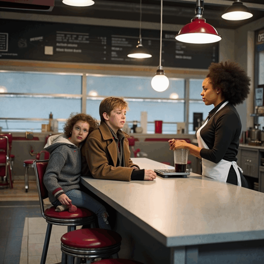 Pendant les trois semaines suivantes, Liam accompagna Sophie chaque matin au diner. Evelyn les nourrissait en silence, sans attirer l’attention ni demander quoi que ce soit en retour. Peu à peu, elle découvrit leur situation difficile :