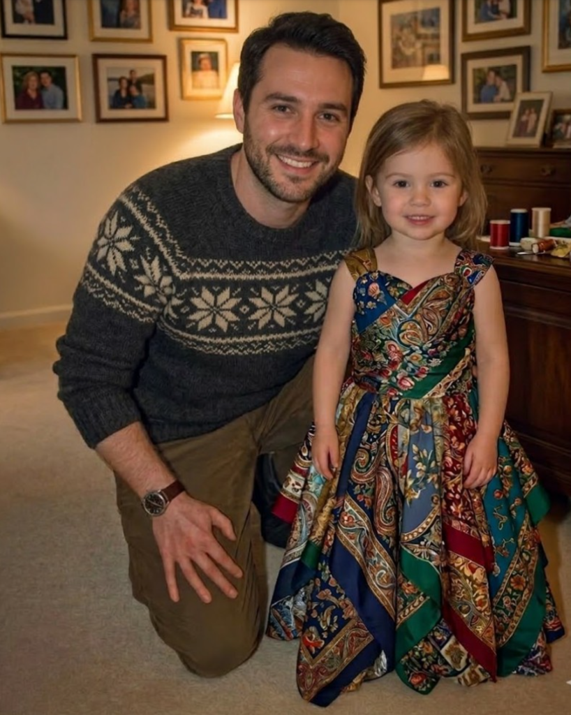 Et alors… l’idée m’est venue.J’ai sorti l’ancienne machine à coudre. Je n’avais jamais cousu auparavant.Mais j’ai essayé.Trois nuits sans sommeil.Erreurs. Défaire. Recommencer.Et peu à peu… le tissu a pris forme.Une robe.Pas parfaite.Mais pleine d’amour.