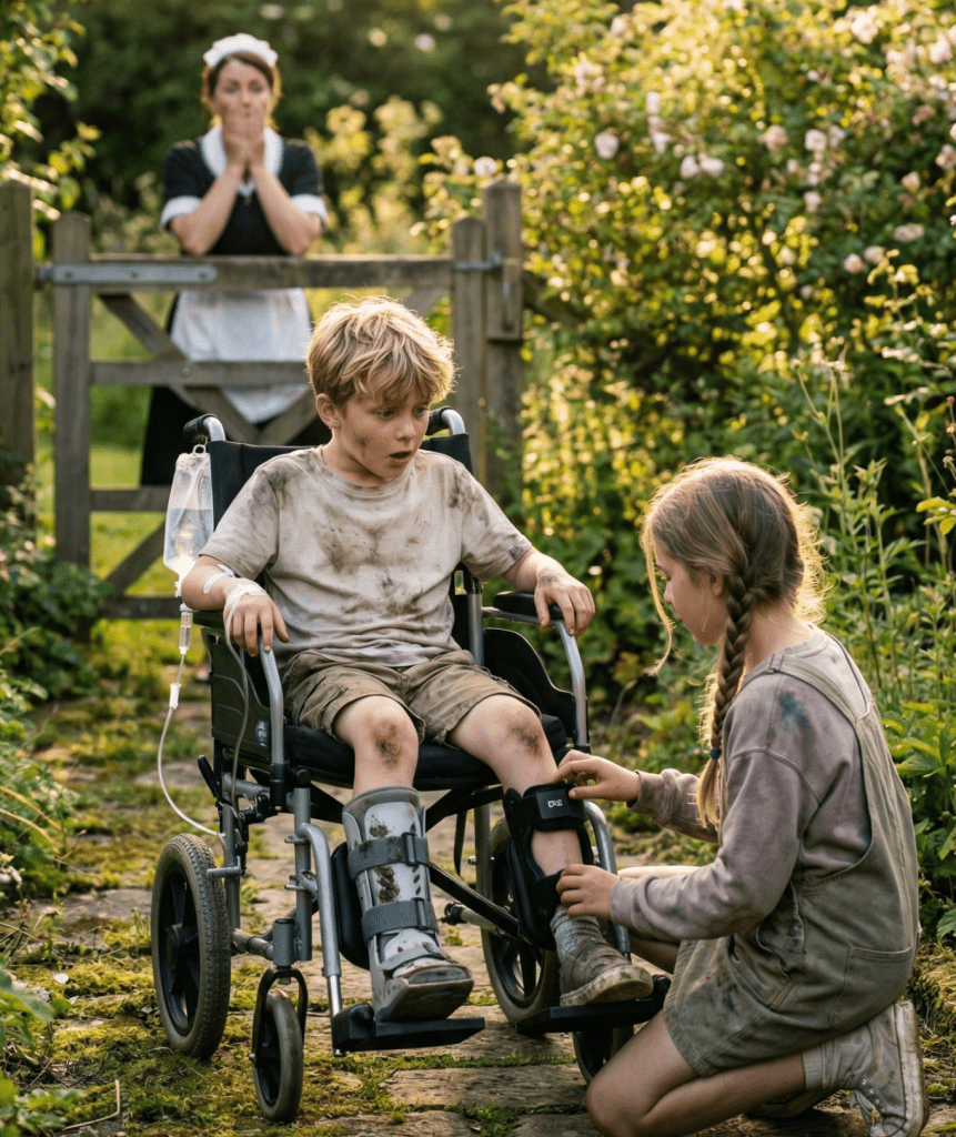 Lucas se pencha en avant, les yeux écarquillés. Lily déterra quelque chose et le montra. Les deux enfants restèrent figés.Le cœur d’Alexander s’arrêta. Il bougea avant de s’en rendre compte — descendant le grand escalier, traversant la terrasse, ses bottes glissant sur les feuilles mouillées.