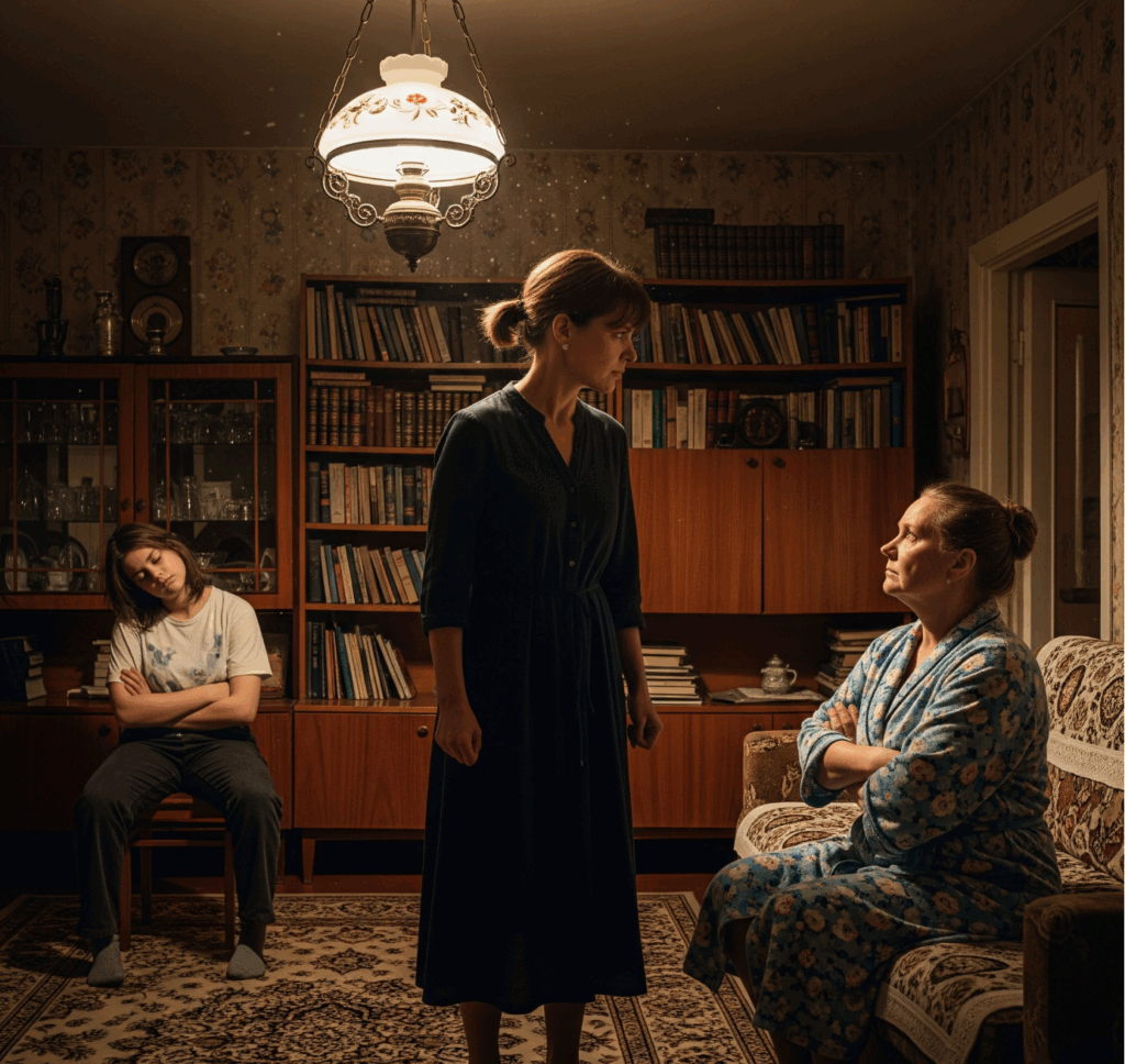 se comportant comme si elle était chez elle, tandis que Lena soutient ouvertement sa mère avec une certaine défiance adolescente. Polina, protectrice et déterminée, affirme clairement que seule Alla, propriétaire légale de l’appartement,