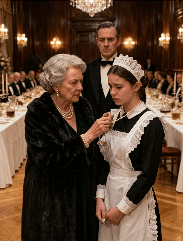 Une jeune serveuse traversait la foule. Elle était fragile, presque invisible dans son uniforme noir, comme si le luxe de la salle cherchait à l’engloutir. Mais autour de son cou… quelque chose scintillait.