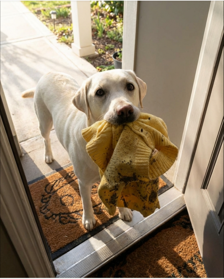 J’ai ouvert la porte, déjà irritée, déjà épuisée — et mon cœur s’est arrêté.Baxter se tenait là, la queue raide, les yeux fixés sur moi. Dans sa bouche, délicatement tenue entre ses dents, se trouvait le pull jaune de Lily.Celui avec le petit soleil brodé près de la manche.