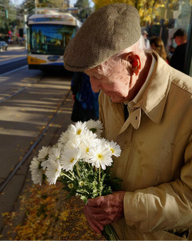 Puis je l’ai vu.Un vieil homme se tenait au bord du trottoir, légèrement voûté, tenant un petit bouquet de marguerites enveloppé dans un plastique transparent. Son manteau tombait sur son corps frêle, usé, décoloré, un bleu sombre transformé en un gris triste et fané.