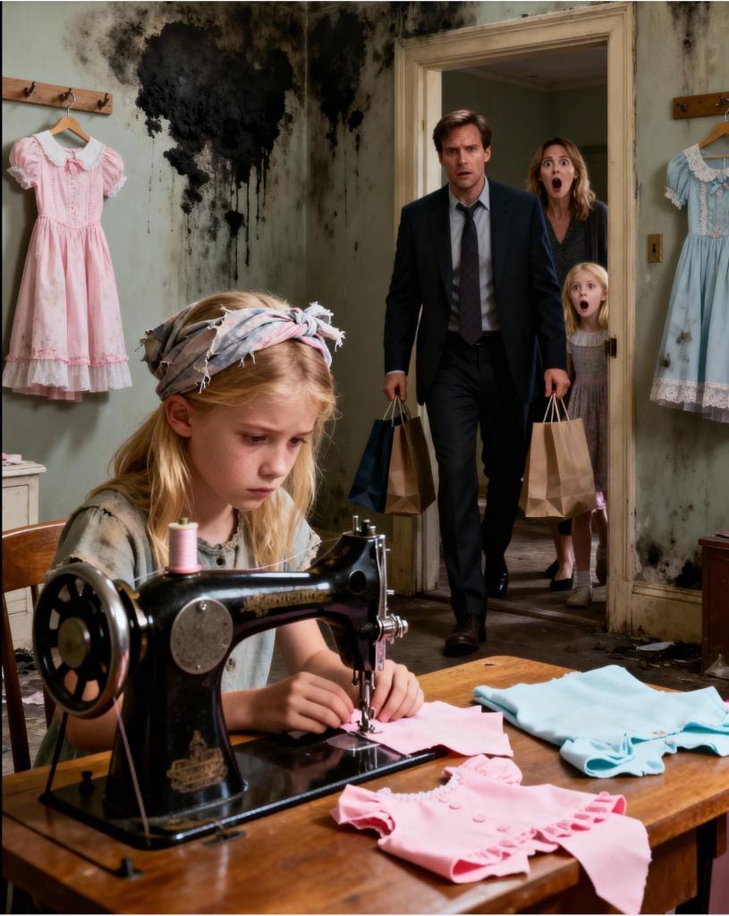 « Qu’est-ce que tu fabriques ? » demanda-t-il doucement, essayant de ne pas l’effrayer.« Des robes, » répondit-elle. « Pour une boutique de Maple Street. Ils payent à la pièce. »