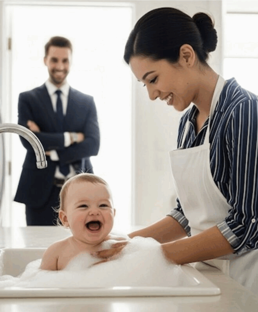 Le calme de Clara et le sourire confiant de Sion apaisent sa réaction. Elle explique doucement que Sion avait de la fièvre la nuit précédente, qu’il avait pleuré sans cesse, et qu’elle avait essayé de le calmer avec un bain chaud — une méthode qui avait déjà fonctionné.